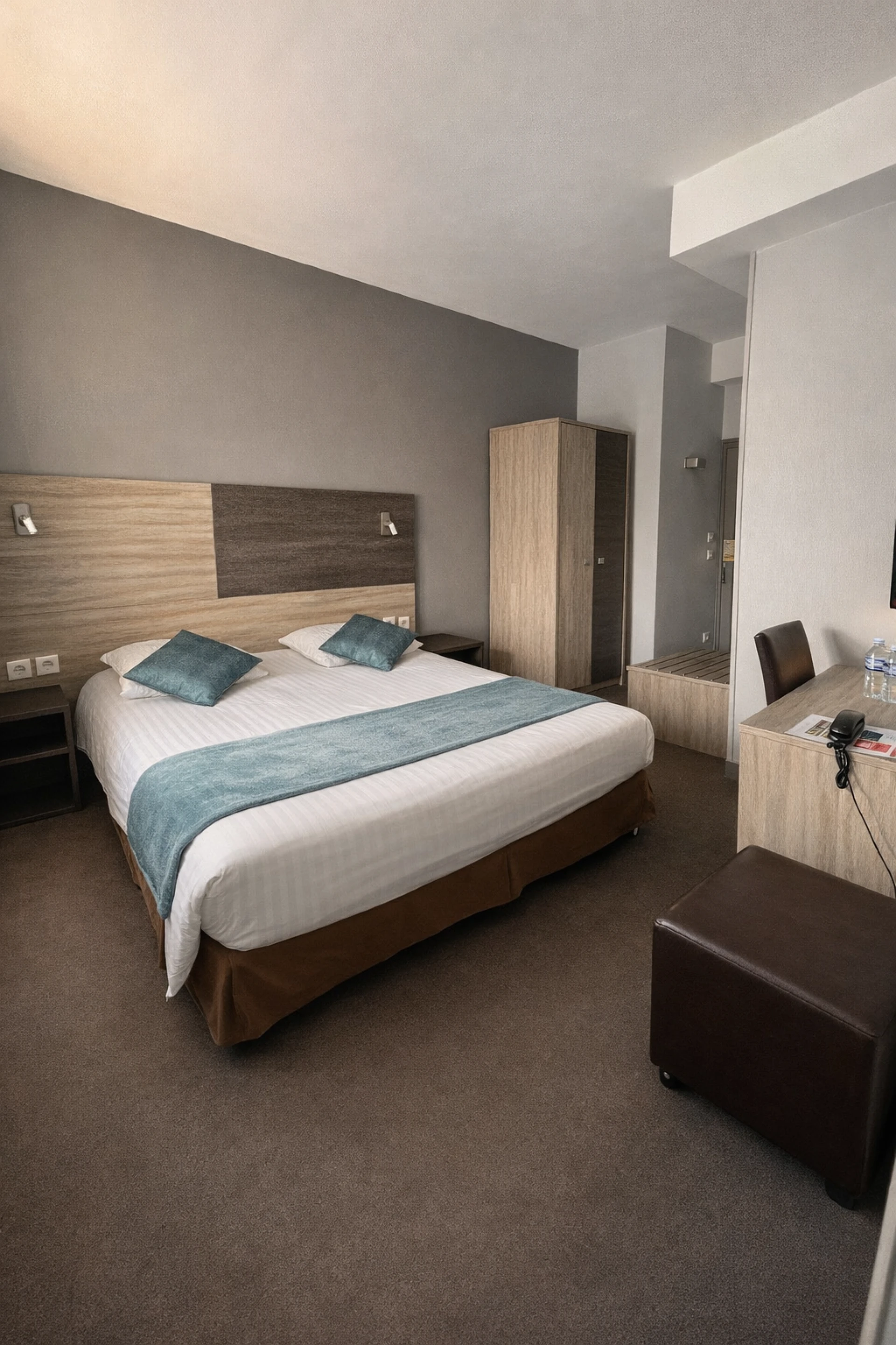 De la chambre double classique ou twin à la chambre familiale ou triple, elles ont en commun de disposer des équipements attendus d’un hôtel 3 étoiles : télévision par câble à écran plat, connexion Wifi, coin bureau, salle de bains avec douche ou baignoire.